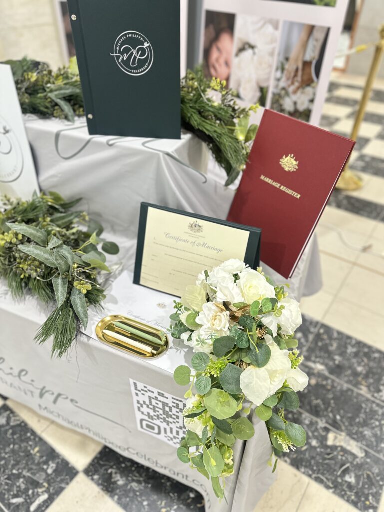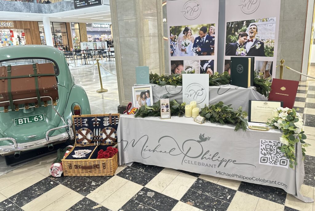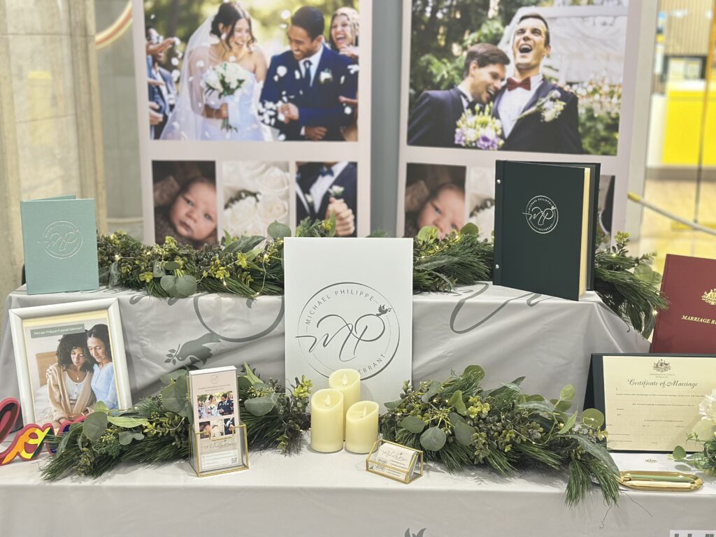 This was my first time exhibiting my celebrant services at an expo, and let me tell you, it was electric. The hum of curious couples, the soft rustle of brochures, and that buzz of possibility in the air. My display table, dressed in soft neutral tones and framed with greenery, candles, and personal touches, was designed to reflect what my ceremonies are all about: authenticity, warmth, and timeless storytelling.